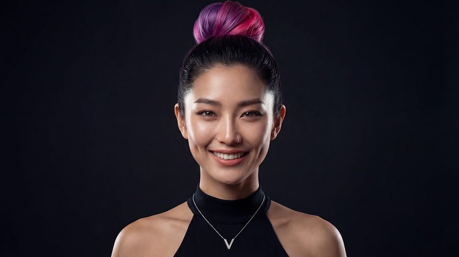 Twenty-six. South Melbourne — the suburb where the Swans began before they moved. 5'2", which surprises people who expect less from someone this size. East Asian heritage. Dark brown eyes. And hair that goes from near-black roots to deep violet to electric pink at the ends — always in that direction. Never the other way round.